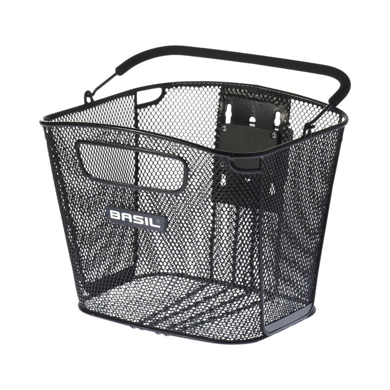 Basil Bold Front KF,Stahl,engmaschig, abnehmbar,inclusive KF Platte 70158, passt auf Basil KF Handlebar Holder 70177 (separat verfügbar), Soft Grip Bügel,refl. Logo,Öse für Netzhaken (NETZ NICHT INBEGR.),in Höhe verstellbar durch Langlöcher, schwarz