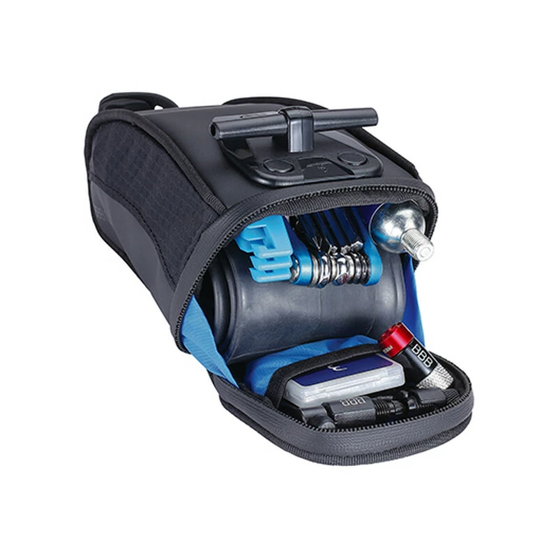 Hochwertige gebogene Satteltasche für die optimale und natürlichste Position unter dem Sattel. Blaue Innenausstattung, für bessere Sichtbarkeit des Innenbereichs. Abschliessbarer Reissverschluss für mehr Sicherheit, absolut geräuschfrei. LED-Rücklicht Montaghalterung. Reflektierendes schwarzes Grafik für bessere Sichtbarkeit. T-Schnallensystem für einfache Montage und Demontage. Rubber Befestigung an der Sattelstütze für zusätzliche Stabilität und Sicherheit.