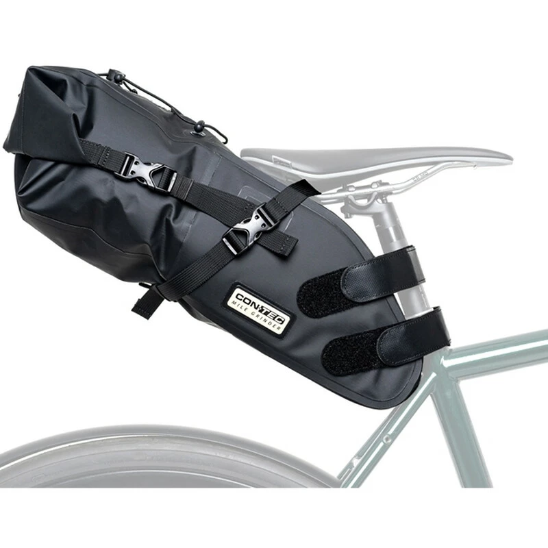 CONTEC Satteltasche “Mile Grinder Back 10” wasserdichte, grossvolumige Satteltasche für Bikepacking aus Polyester / PVC. Die Konstruktion ist auf maximale Stabilität bei der Fahrt ausgelegt: Flexibler Rollverschluss und Kompressionsriemen minimieren Verrutschen des Gepäcks, rutschfeste Beschichtung an den Kontaktstellen verhindert Kratzer an der Sattelstütze und Verrutschen der Tasche auch im Gelände. Schlaufenzug an der Oberseite zur Befestigung von Jacke etc. Aufnahme zur Anbringung von Sicherheitsleuchten an der Rückseite.