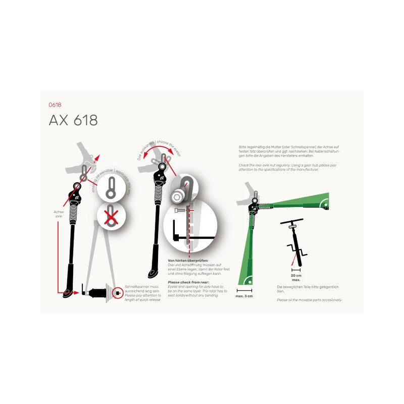 Der AX 618 bietet die Universallösung für Fahrräder die weder über eine Ständeraufnahme noch über eine geeignete Rahmengeometrie zum Klemmen eines Fahrradständers, jedoch über Ösen verfügen. Der AX wird dann direkt auf der Achse montiert und zusätzlich über die Ösen gesichert. Auch im Set mit dem Scheibenbremsadapter 0699 DA für IS2000 erhältlich.
