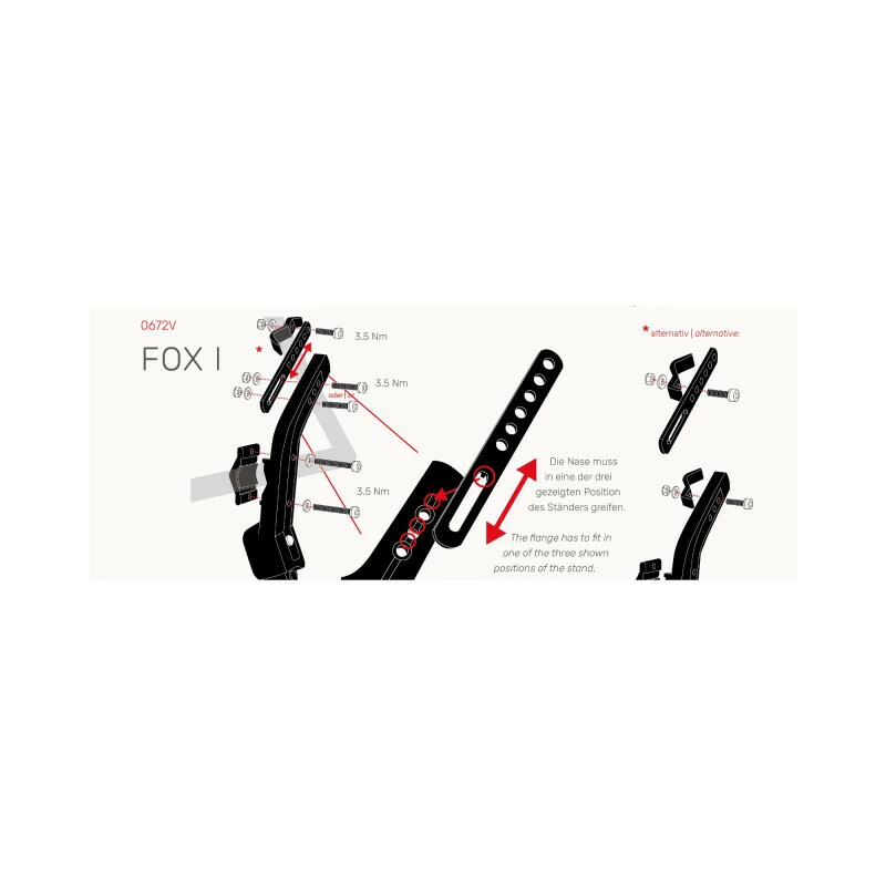 Der FOX l ist die Lösung für Fahrräder, die ab Werk über keine Ständeraufnahme verfügen. Der Ständer wird mit Schrauben am Rahmendreieck befestigt und ermöglicht so das sichere Abstellen des Rades. Die längenverstellbare Kopfschiene und die Prismaaufnahme machen den FOXl für nahezu allen Rahmengeometrien und Fahrradspezifikationen kompatibel.