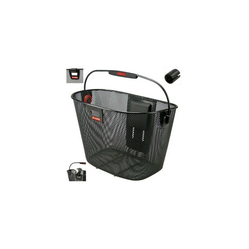 Korbmodell mit elegantem Kunstoffgriffgelenk. Die Korbposition ist hier stufenlos höhenverstellbar. Der zylinderförmige Lampenhalter erlaubt die Montage von Batterieleuchten an der Frontseite des Korbes. Der Lampenclip wird vorne auf den Korbrand geklickt. Auch voll beladen wird das Licht nicht verdeckt.