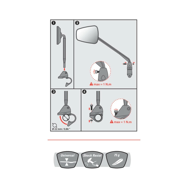 Der ZS56 hat eine sehr robuste Stange aus glasfaserverstärktem Kunststoff, die auf dem Lenker befestigt wird. Dieser Rückspiegel hat die grössten Spiegelmasse auf dem Markt.